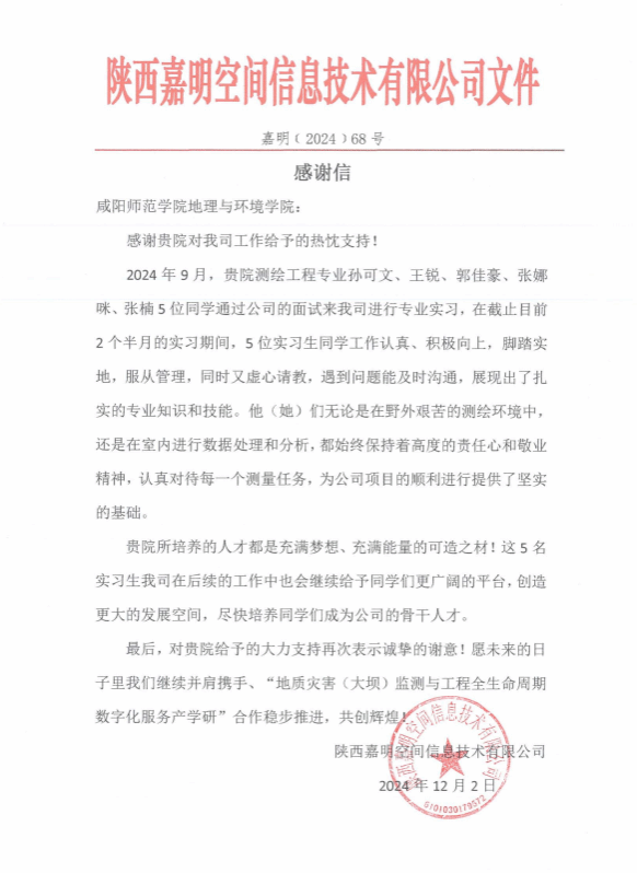 12月2日,陕西嘉明空间信息技术有限公司发来感谢信,对公司对公司给予的支持表示感谢,对公司2021级测绘工程专业在该单位实习的5名同学的优异表现进行表扬。在感谢信中,陕西嘉明空间信息技术有限公司称赞孙可文、王锐、郭佳豪、张娜咪、张楠5名实习生同学工作认真、积极向上,脚踏实地,服从管理,同时又虚心请教,遇到问题能及时沟通,展现出了扎实的专业知识和技能;表扬他们无论是在野外艰苦的测绘环境中,还是在室内进行数据处理和分析,都始终保持着高度的责任心和敬业精神,认真对待每一个测量任务,为公司项目的顺利进行提供了坚实的基础。